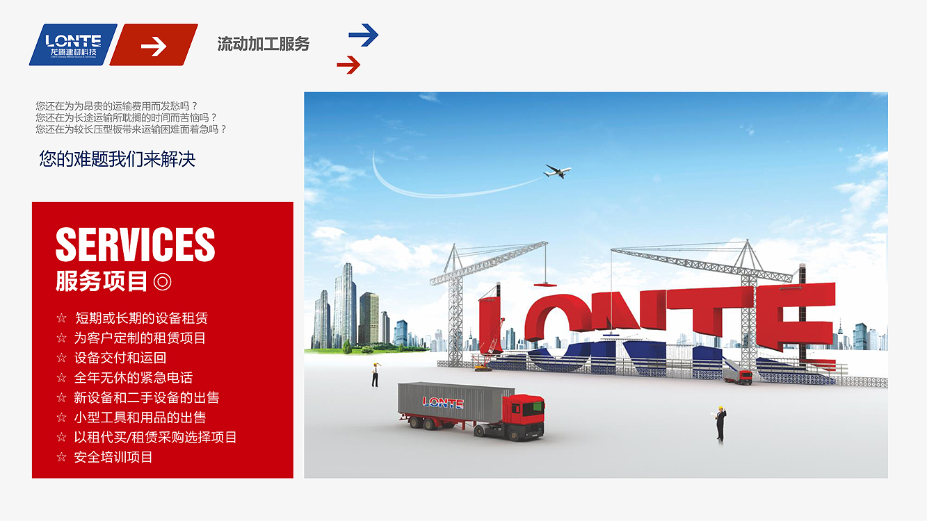 現(xiàn)在,您只需花很少的錢,就可以擁有別人無法比擬的便捷和效率,真正達(dá)到現(xiàn)場生產(chǎn),隨心所欲,不用再擔(dān)心質(zhì)量和運(yùn)輸時耗上的問題。龍騰建材科技以專業(yè)化和客戶化的租賃解決方案,全面滿足客戶的施工需要,使客戶不再為施工淡季時的自有設(shè)備閑置和有限資金占用而擔(dān)憂;使施工單位的固定成本變?yōu)榭勺兂杀荆阌诔杀竟芾砗透咝┕?;降低諸如設(shè)備運(yùn)輸和后勤保障等方面的苦惱。通過我們不同產(chǎn)品的租賃服務(wù)提供,還可使廣大施工企業(yè)克服自有設(shè)備所導(dǎo)致的施工局限性;發(fā)揮租賃服務(wù)功能的“杠桿效應(yīng)”,近而突破施工的專業(yè)限制。使客戶在未來的工程競爭中,南北縱橫,增強(qiáng)施工企業(yè)的競爭活力。